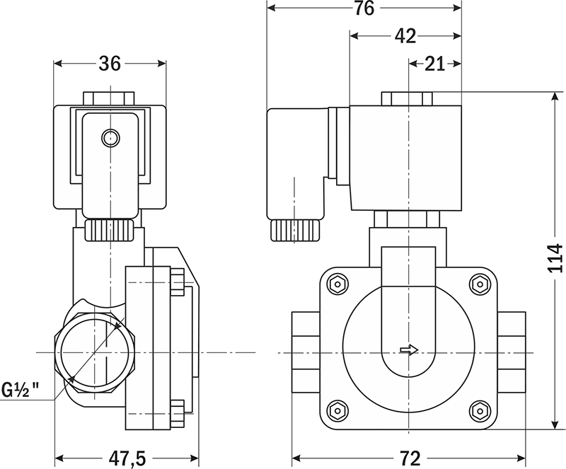 Нормально закрытый соленоидный клапан – это магнитный клапан, в котором закрытое положение сохраняется, если управляющее напряжение на его индукционную катушку не подается. При подаче напряжения на катушку нормально закрытый клапан открывается и пропускает через себя поток рабочей среды. При отключении управляющего напряжения этот клапан автоматически закрывается и перекрывает поток рабочей среды в трубопроводе. При обрыве провода управляющего напряжения клапан будет закрыт.