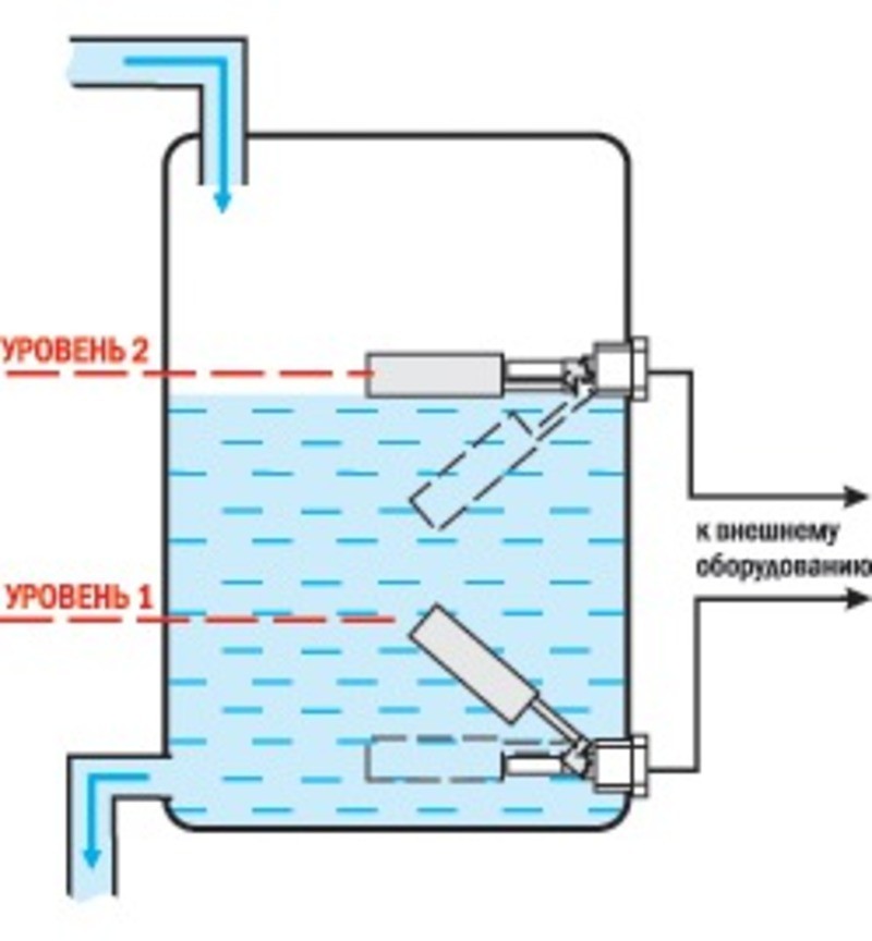 - В зависимости от способа установки датчика выходной контакт замыкается или размыкается при понижении уровня жидкости