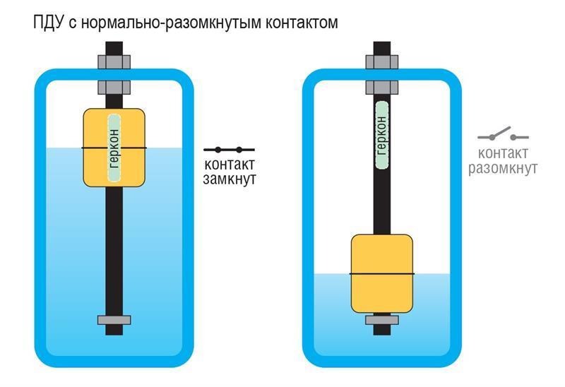 Повышение уровня жидкости в резервуаре приводит к перемещению поплавка вверх и замыканию/размыканию контакта датчика уровня.