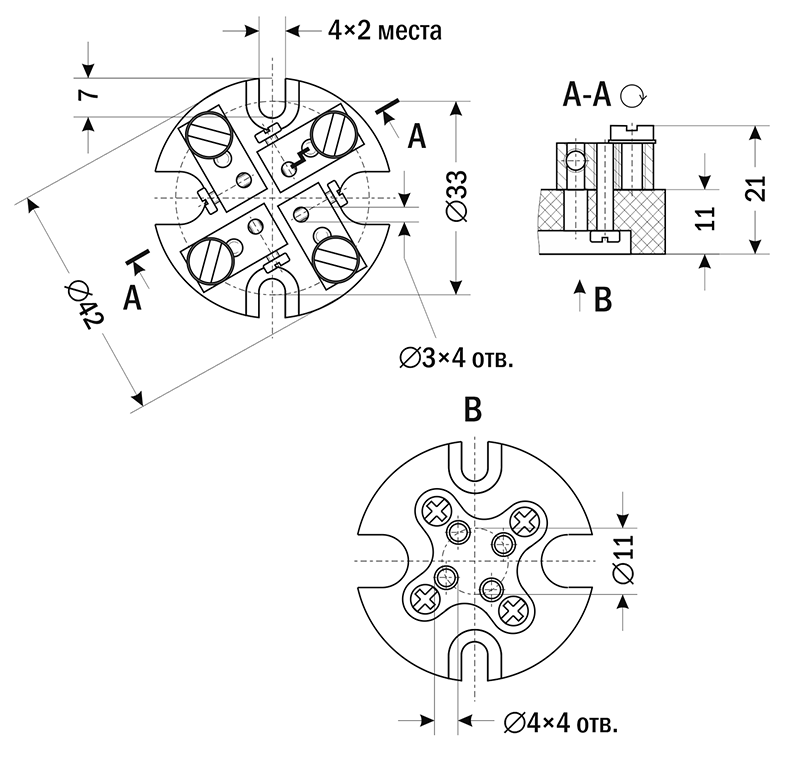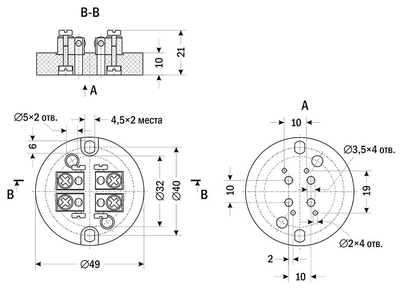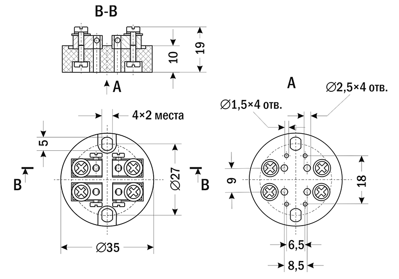 | Диаметр отверстий в клеммах под выводы датчика | – | – | 2 отв. × ∅ 2,5 мм | 4 отв. × ∅ 2,5 мм | 4 отв.×∅ 3 мм | – | 4 отв.×∅ 3 мм | 2 отв.×∅ 3,5 мм | 4 отв.×∅ 3,5 мм | 2 отв.×∅ 2,5 мм | 4 отв.×∅ 2,5 мм |