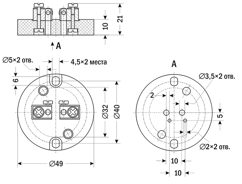У колодок КТП-49-40-2 и КТП-49-40-4 имеются дополнительные монтажные отверстия с расстоянием между центрами 32 мм (см. чертеж). Можно использовать эти колодки для коммутационных головок с расстоянием между монтажными отверстиями 33 мм. Необходимо соблюдать осторожность при затягивании винтов, чтобы не вызвать разрушение колодки.