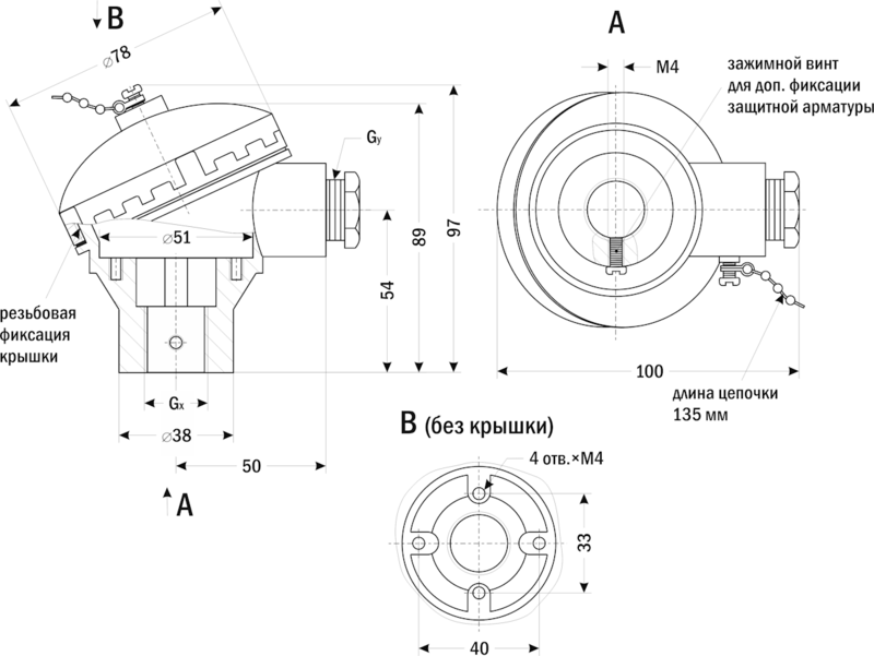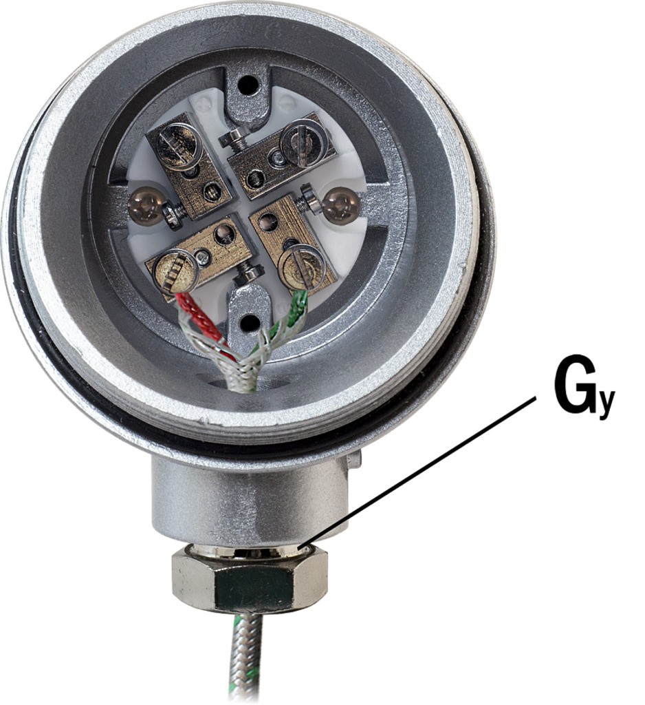 В коммутационную головку с помощью винтов М4 (не входят в комплект) монтируется клеммная колодка, к которой с одной стороны присоединяются контакты датчика температуры, с другой — контакты кабеля. Вывод датчика и присоединение защитной арматуры для него производится через отверстие с резьбой Gx (см. чертеж). Кабельный ввод — отверстие с резьбой Gy (см. чертеж).
