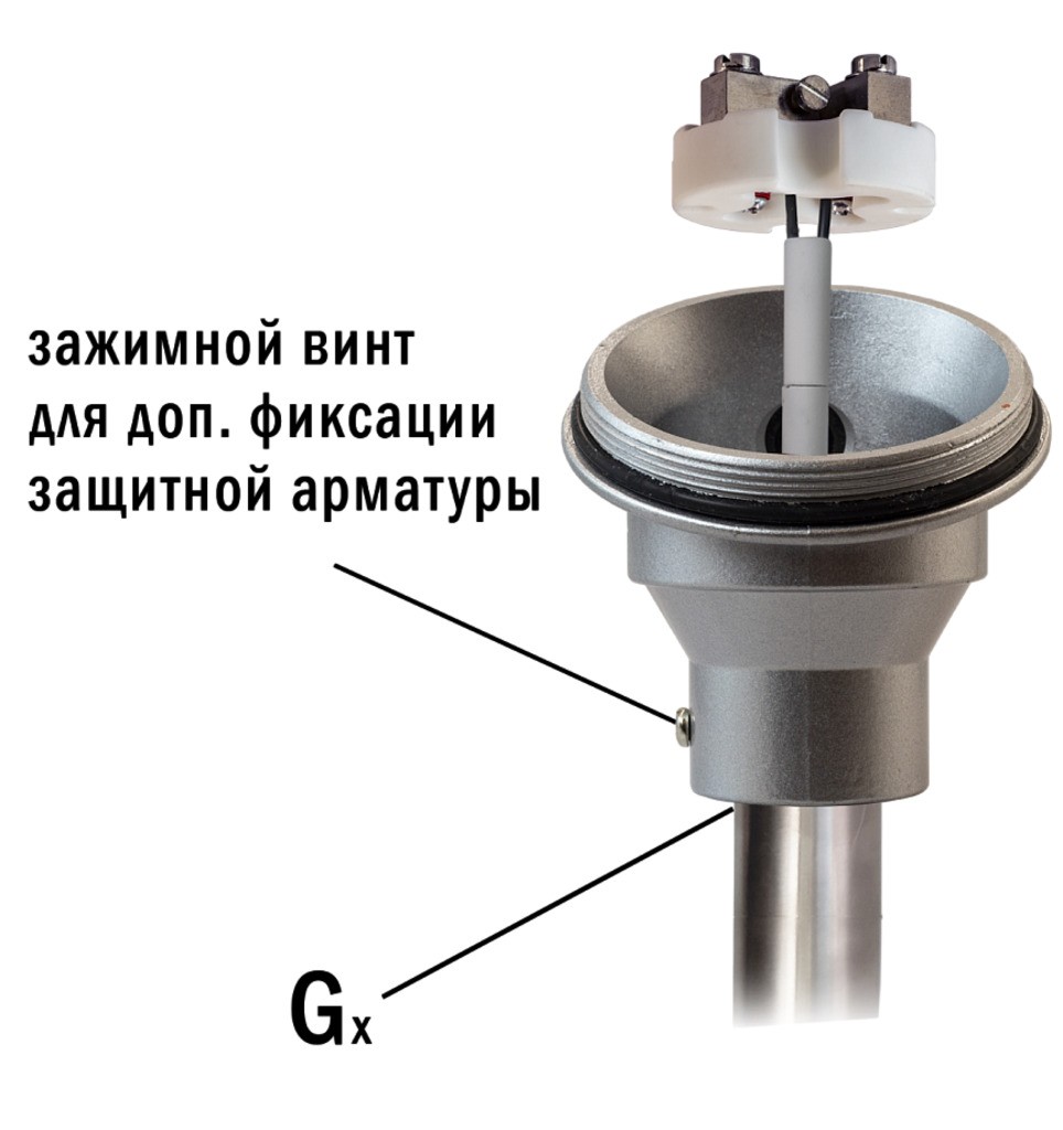 - Дополнительная фиксация защитной арматуры зажимным винтом М4 (см. чертеж). Также с помощью винта М4 большей длины (не входит в комплект) можно закрепить в отверстии Gx арматуру без резьбы
