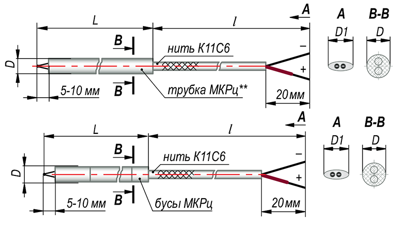 | Тип изоляции | Трубка МКРц, бусы МКРц | ||